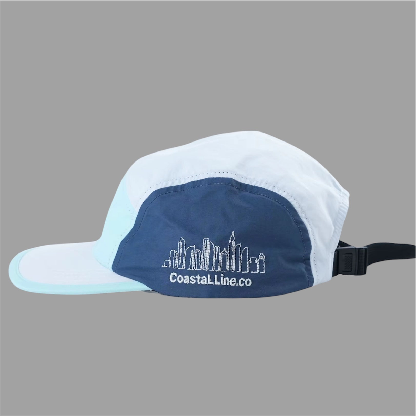 A lightweight 5-panel cap blending coastal style with urban edge. The front features the bold CL logo with a wave design and “COASTALLINE” text on a light aqua panel. Navy side panels showcase an embroidered city skyline with CoastaLLine.co text. Built from durable, breathable nylon/poly blend with a flat bill trimmed in aqua. Adjustable nylon strap with quick-release buckle ensures a perfect fit. Perfect for beach days, city walks, and everyday wear.