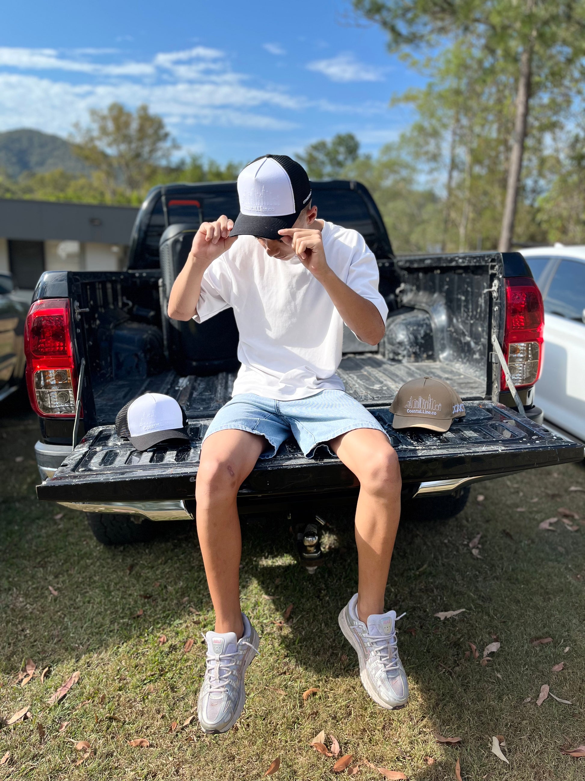 This premium trucker cap features a crisp white structured front panel with an embroidered city skyline and the signature CoastaLLine.co branding, giving it a sleek and minimal finish. The black curved brim adds a strong contrast, while the mesh back panels keep it breathable and comfortable in any season.